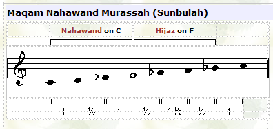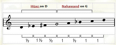 ![]() Maqam Nahawand has two versions shown above. In general the first version (Nahawand-Hijaz) is used on the way up, and the second version (Nahawand-Kurd) is used on the way down. |