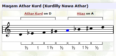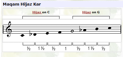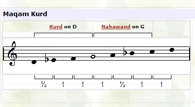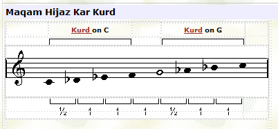 maqam, except the 2nd note is 1/2 step lower. Although maqam Hijaz Kar Kurd has the same tonal intervals as maqam Kurd, it is not a transposed version of that maqam, because the dominant in this case is the 5th snote while in maqam Kurd the dominant is on the 4th note. |