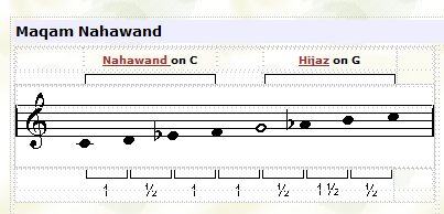 Maqam Nahawand has two versions shown above. In general the first version (Nahawand-Hijaz) is used on the way up, and the second version (Nahawand-Kurd) is used on the way down. |