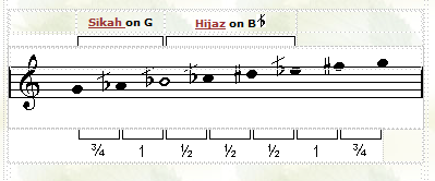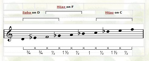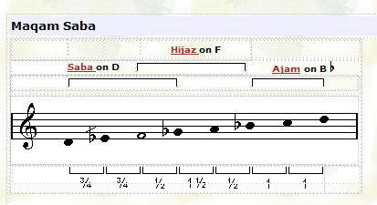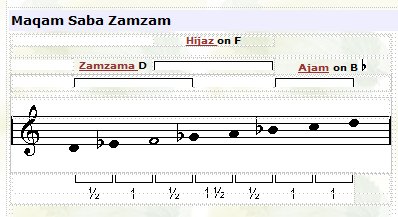 ![]() Maqam Saba Zamzam resembles maqam Saba, except the 2nd note is 1/4 step lower. In other words instead of the first 3 notes forming the beginning of a Bayati tetrachord, they form the beginning of a Kurd tetrachord. |
